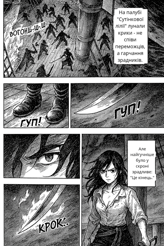 На палубі «Сутінкової Лілії» лунали крики — не співи переможців, а гарчання зрадників, п’яних власною злістю. Дерев’яні дошки дрижали під ногами, гупали важкі чоботи, блищали клинки, але найгучніше било в скроні зрадливе: «Це кінець».