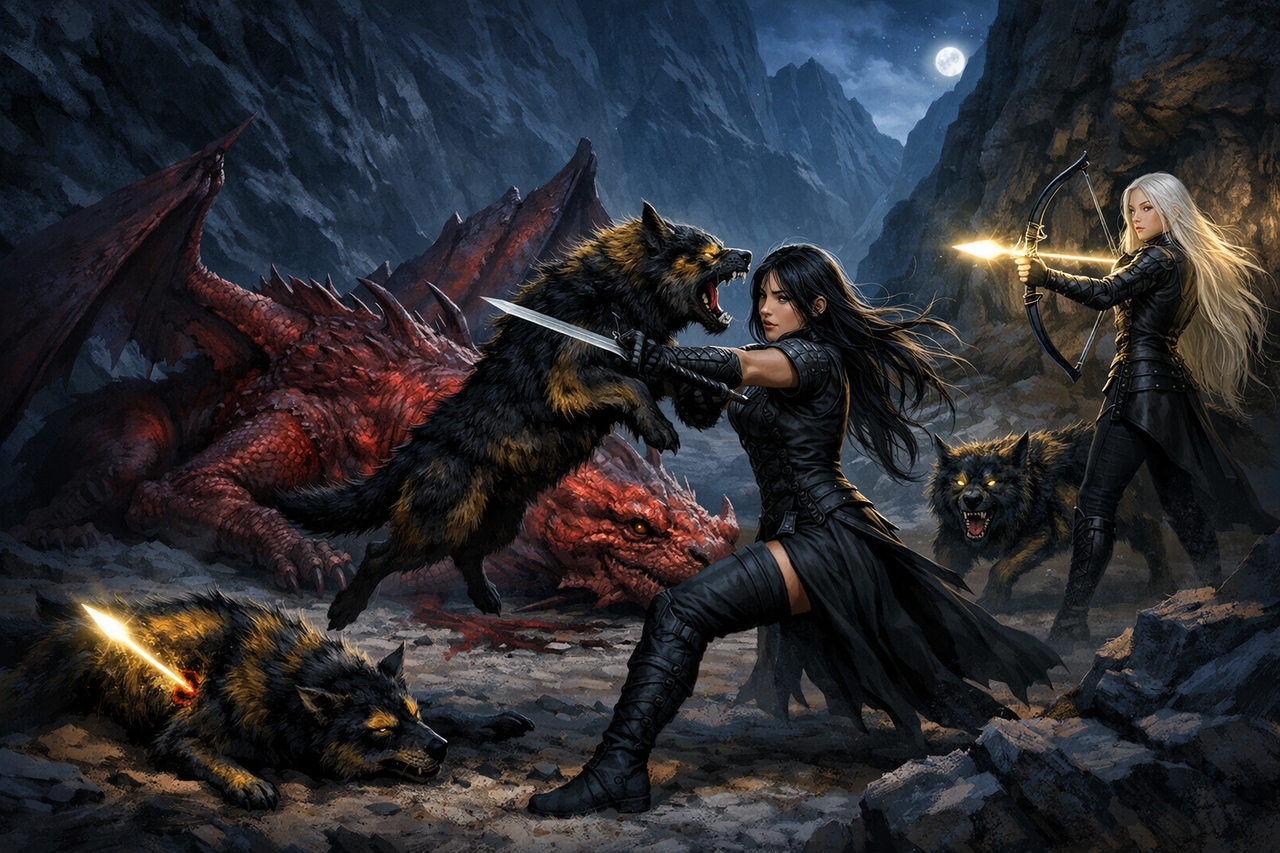 Вибігши з-за повороту Катріна відразу ж втрапила в самісінький вир подій. Удар мечем, і голова найближчого шора падає на землю. Стрибок вперед. Перекат. Ще один удар і ще один шор падає мертвий. Сильний стусан під хвіст шору, який націлився на незахищену шию дракона, і тварюка врізається головою в скелю, тільки кров бризнула в різні боки.