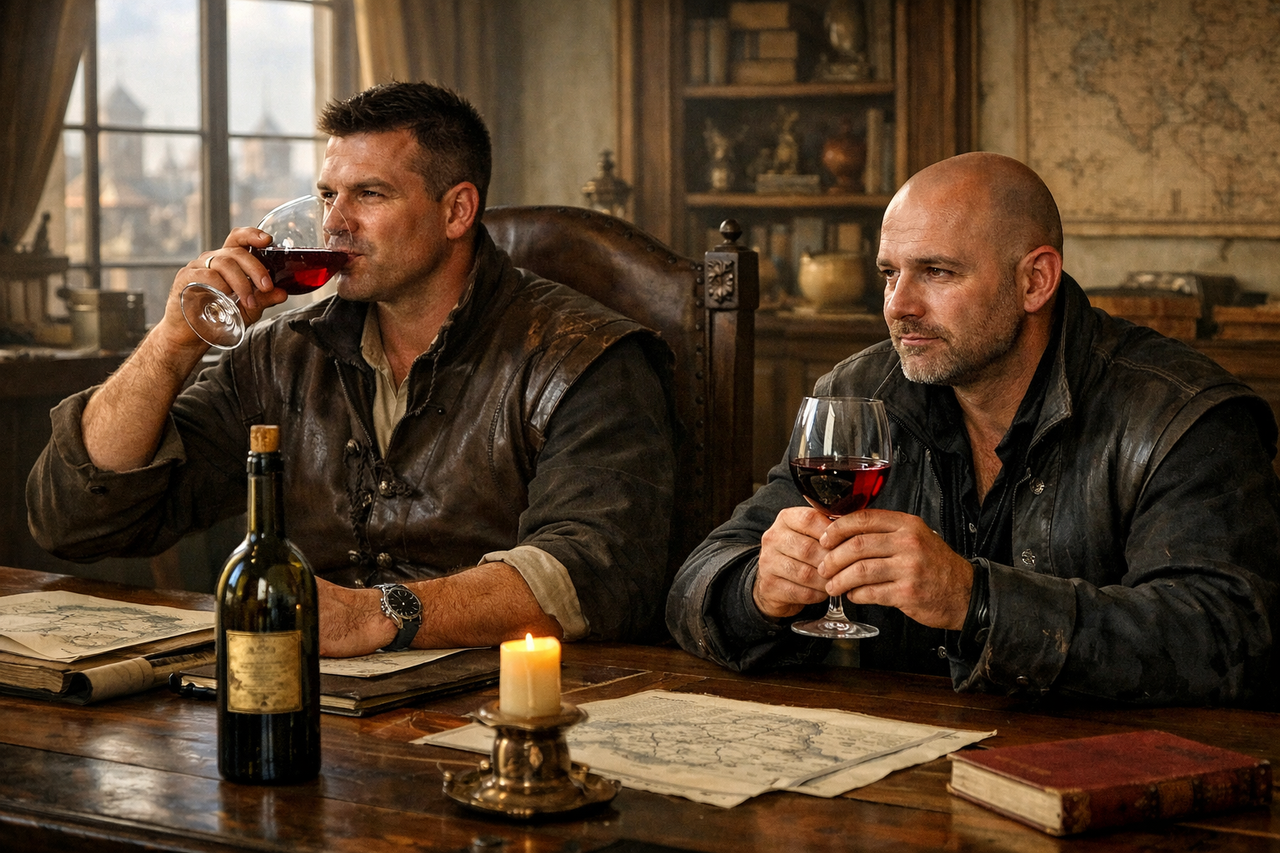 Поки слідчий зачиняв двері, ле Онейр дістав звідкись з-під столу пляшку дорогого вина та два келихи. Не чекаючи, поки старий друг почне відмовлятися від випивки, налив вино у келихи. Один із них містоуправитель узяв у руки, а другий підсунув ближче до слідчого, що сідав на стілець.