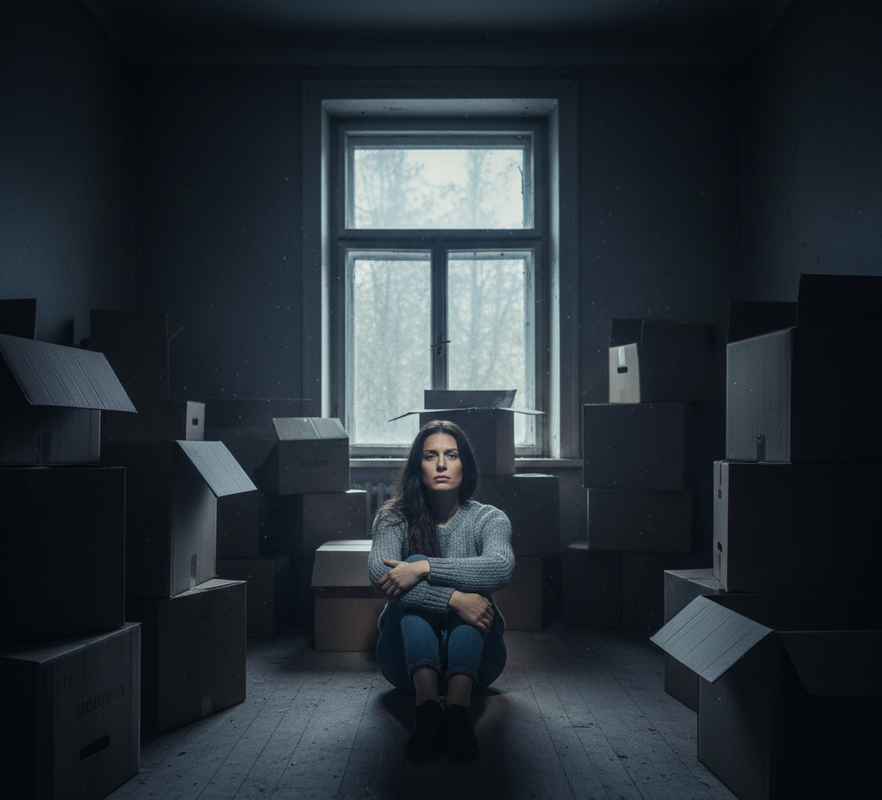 Густа, пильна тиша порожнього будинку. Ніякої зали суду. Ніяких адвокатів. Лише сіре світло з вікна, що ледь пробивалося крізь брудне скло, і коробки. Десятки картонних коробок, розставлених по кімнаті, як надгробки на цвинтарі її минулого життя.