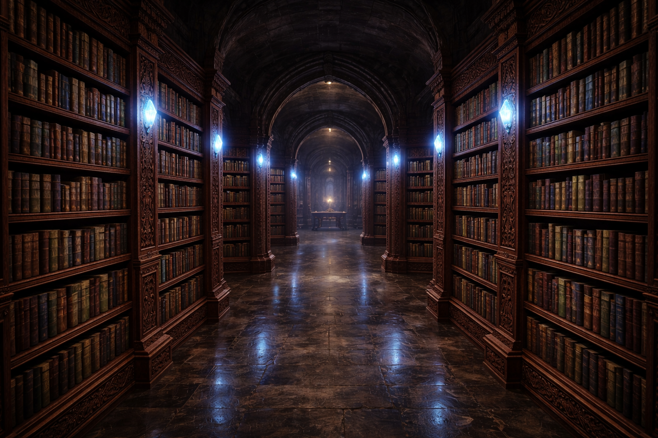 Один за одним магічні кристали в стінах спалахнули холодним світлом, і темрява відступила, повільно, неохоче. Світло ковзнуло по довгих стелажах, по шарах пилу, по старих палітурках, що мовчки зберігали чужі катастрофи.