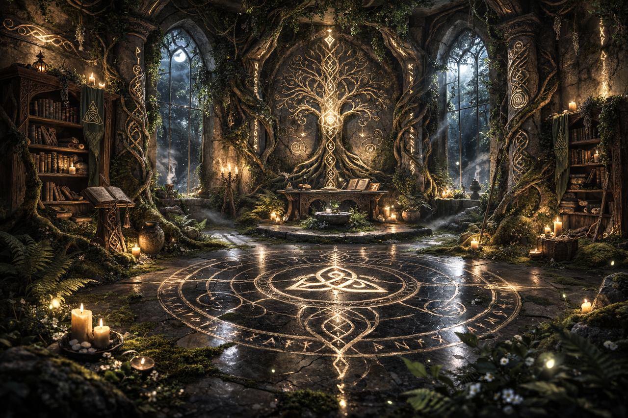 Попід стінами стояли полиці з книгами та сувоями. Дерево, шкіра, пергамент — усе мало свій запах: терпкий, глибокий, давній. Поряд із ними — невеликі столи з розгорнутими фоліантами, чорнильницями й тонкими різцями для різьблення знаків. Біля підніжжя колон тліли свічки, а між камінням проростав мох і дрібні папороті, ніби ліс поволі повертав собі це місце.
