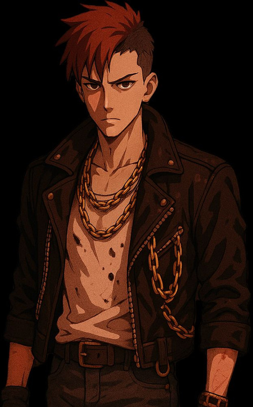 Просто на лаві біля столу лежав якийсь дивак без жодних ознак життя. Він був одягнений у шкіряну куртку темного кольору з купою замків, білу футболку з дірками, ніби від куль, та сині джинси з безліччю нашивок і прикріпленими ланцюгами. З шиї звисало кілька ланцюжків різної товщини й довжини. Зачіска взагалі вражала: боки були майже виголені налисо, зате зверху спадала довга червона шевелюра з пасмом волосся, що звисало на правий бік. Ліве вухо прикрашала масивна чорна сережка, а на руці виднілося татуювання дракона.