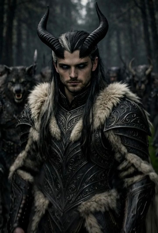 З його чола здіймалися чорні та величні, покручені роги, поцятковані кільцями, як столітні дерева. Довге темне волосся перекреслювали сиві, мов попіл, пасма — живий символ тієї ціни, яку він сплатив за свою руйнівну могутність.
