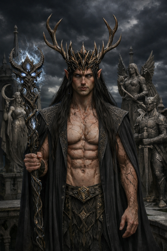 Морган подивився вгору. Масивні оленячі роги, що вінчали голову, були частиною плоті цієї істоти, перетворюючи її на дикого володаря, що несе війну всьому сущому. Чорне волосся змішувалося з важким плащем, зітканим із самих тіней, а в кулаці постать стискала посох із мертвої деревини та кісток. Череп на верхівці посоха випромінював примарне, бліде сяйво.