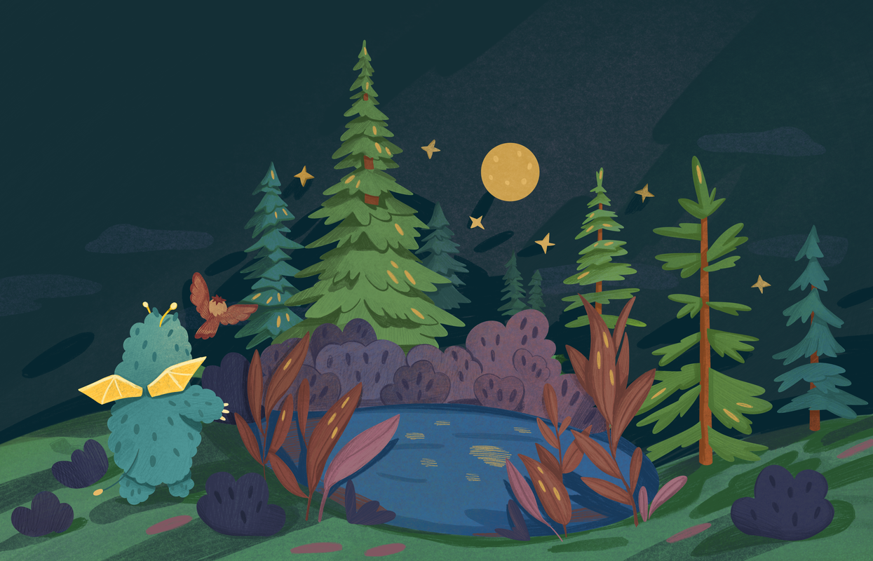 Наступного дня Бабай заглядав у всі закутки лісу. Йому хотілося, щоб нове місце дуже сподобалось совеняті. А коли надвечір совенятко прокинулось, бо вдень воно трохи спало, то вони попрямували до мальовничого озера, навкруги якого росли високі ялинки. Там було досить затишно, багато моху росло між деревами і з однієї з ялинок відкривався чудовий краєвид. Коли настала ніч, на небі з’явився повний місяць і засвітив так гарно, що його стало видно на водяній гладі озера, навкруги було пречудово. Совеняті тут сподобалось, а ялинки були надійним прихистком для нового друга Бабая. До того ж, тепер він міг пугикати хоч усю ніч і нікому не заважати спати.