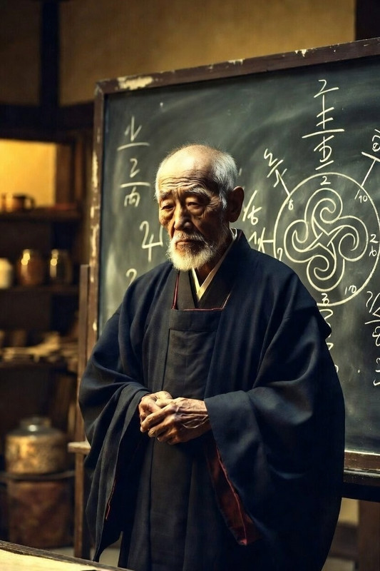 Майстер Шінкей. Жива легенда серед магів, що здавалася такою ж давньою, як крейдяні символи на його дошці. Його постать губилася у важких складках темно-синього хакама. Шкіра майстра нагадувала мереживо глибоких зморшок — кожна з них здавалася руслом, яким колись протікала неймовірна сила. Його високе чоло було поцятковане пігментними плямами, наче мапа невідомих сузір'їв, а з-під важких повік дивилися гострі, майже чорні очі. У них не було старечої каламуті — лише пронизливий блиск, здатний вмить вирахувати найменшу помилку в заклятті. Коротка срібляста борода додавала йому схожості з аскетичним ченцем.