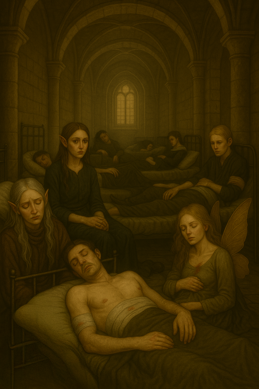 Вілланія сидить на краю імпровізованого ложа. Її вологі пасма прилипли до щік. Вона виснажена, але язик іще шепоче, а пальці креслять руни. Я бачу, як тремтять її руки, та вона не припиняє. З долонь струмує зелений світ, стягуючи рвані рани. Жінка-ельф на підстилці важко дихає, і кожен її вдих звучить, як ніж по склу.