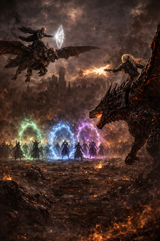 Навколо все остаточно валиться. Один із медних драконів горить просто в повітрі. Хтось із молодших оре біля стіни. Земля внизу залита кров’ю і тілами, своїми й чужими, і своїх уже надто багато. Портали й далі плюються новими загонами. Демонів стільки, що будь-яка мотивація продовжувати боротьбу починає звучати як маячня.