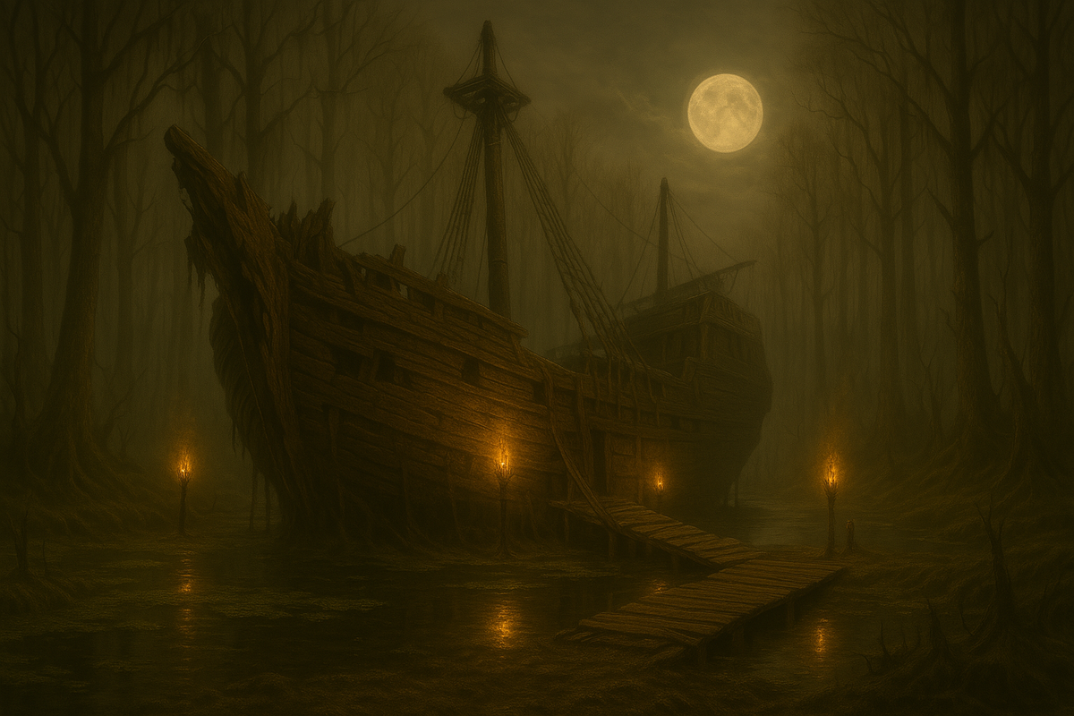 Біля судна невелике болото, де бруд, що чавкає, і ряска надають місцю зловісного відтінку. Хтось (напевно, з вершників) проклав дерев'яні сходні, щоб безпечно дістатися на борт. Сам корабель давно висох, і його дерев'яні дошки, хоч і потріскалися, але все ще витримують вагу.