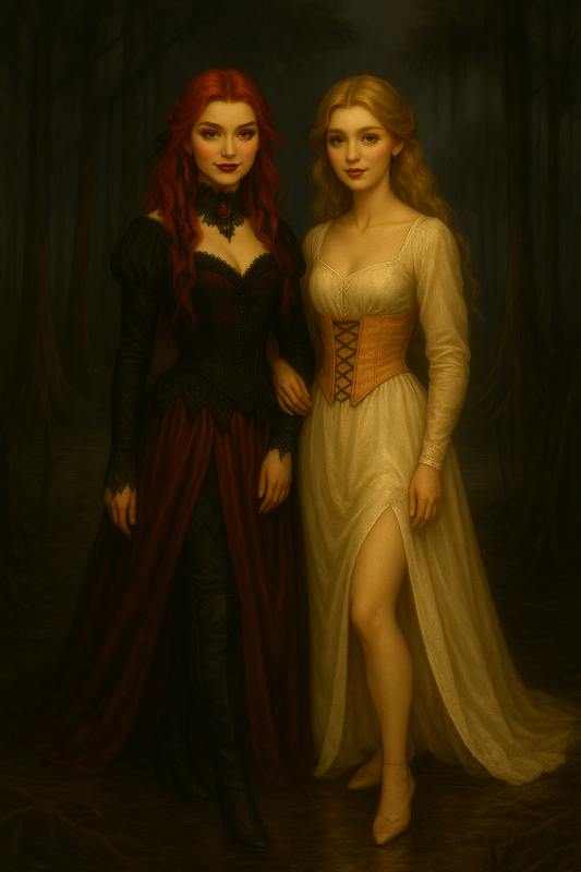 Моє волосся укладене хвилями. Кілька пасом заколоті ззаду, обрамляючи обличчя, а решта вільно струмує по плечах. У вухах мерехтять маленькі перлинні сережки, доповнюючи образ чимось простим, але витонченим. Я наче втілення спокою і ніжності, поруч із Морганою, її вогнем і темрявою. Нехай це й стереотип, але наші образи одразу свідчать, що я фея, а подруга — вампір і вершниця.