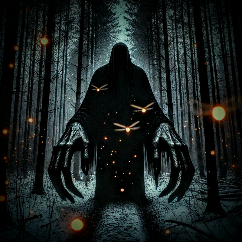 І раптом, серед тиші лісу, почули глухе гуркотіння, і з-за дерев виникла величезна тінь. Це була істота, темна, майже непрозора, і її очі палахкотіли червоним світлом.