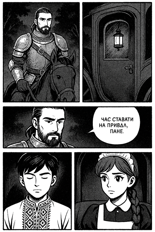Голос чоловіка, хоч і стриманий, звучав упевнено. Кінь під ним легко ступав, розриваючи тишу навколо тихим стуком копит. Вершник трохи нахилився до вікна карети, де мерехтіло слабке світло ліхтаря, очікуючи на відповідь.