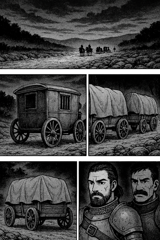 Попереду котилася старовинна карета зі стертою обшивкою, що колись могла бути розкішною. За нею повільно рухалися два вози, накриті грубими полотнищами, які ховали вантаж від чужих очей.