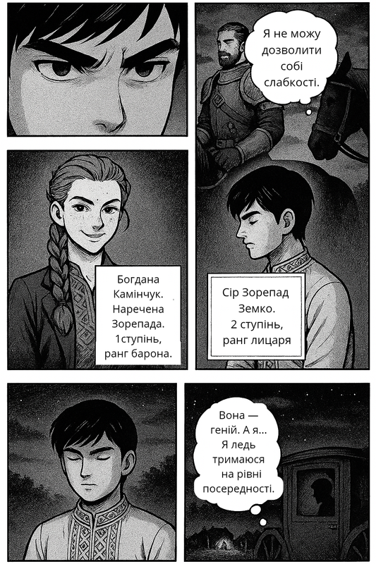 Почувши голос ззовні, юнак, якого звали Зорепад, повільно розплющив очі. Його погляд, зосереджений і холодний, на мить затримався на вершникові, після чого він лише мовчки кивнув.