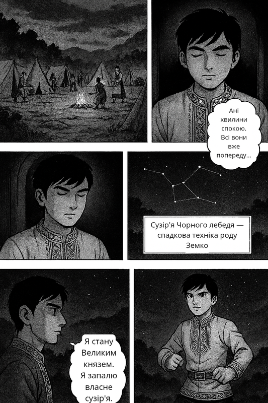 Хлопець підняв погляд до неба, його очі вперлися в сузір'я Чорного Лебедя. Ці зорі, що спліталися в образ величного птаха, здавалися вічними свідками його долі. Ім’я цього сузір’я носила родова техніка культивації та бойове мистецтво Земко — спадщина, яка текла у його жилах і зв’язувала хлопця з предками.