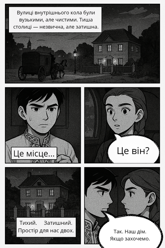 Вулиці внутрішнього кола Світозарська були вужчими, ніж Богдана очікувала, але чистими й викладеними рівним сірим каменем. Віз, на якому вони їхали, стишив хід, коли карета піднялася на пагорб, де за кованою огорожею виднівся невеликий двоповерховий маєток.