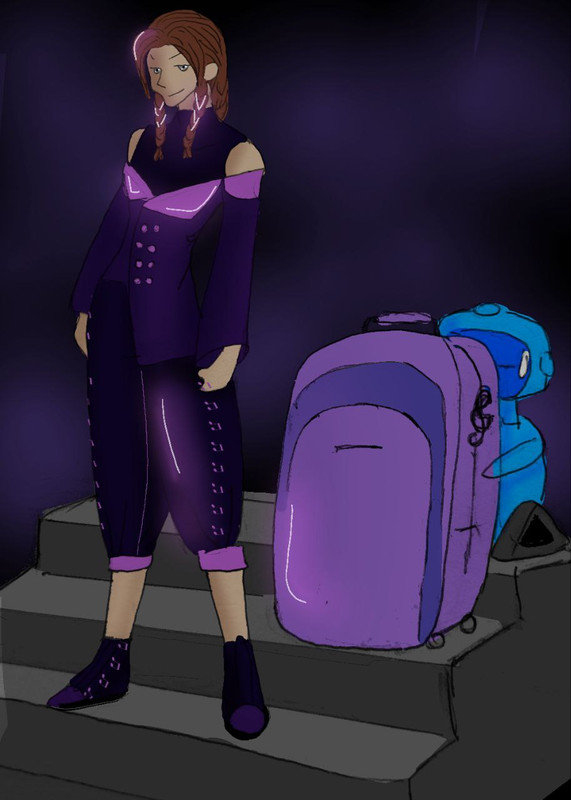 бриджи у тон їм облягаюча кофтина під горло, але без рукавів, поверх "кімоно" з фіолетовим воротом, що гармонійно поєднувався такими саме пуговицями і фіолетового кольору візерунками по швах бридж.