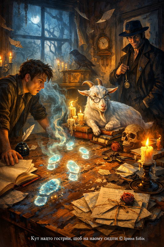 — А з чого мені його черпати? — буркнув Левко, дивлячись на порожню чорнильницю та козу, що вже почала підозріло приглядатися до його лівого черевика. — З оцих стін чи з твоїх загадок? Тут же нічого, крім туману і дивних бабів, немає! Може, мені натхнення у Марисі позичити? Вона ж у нас ходяча енциклопедія ...