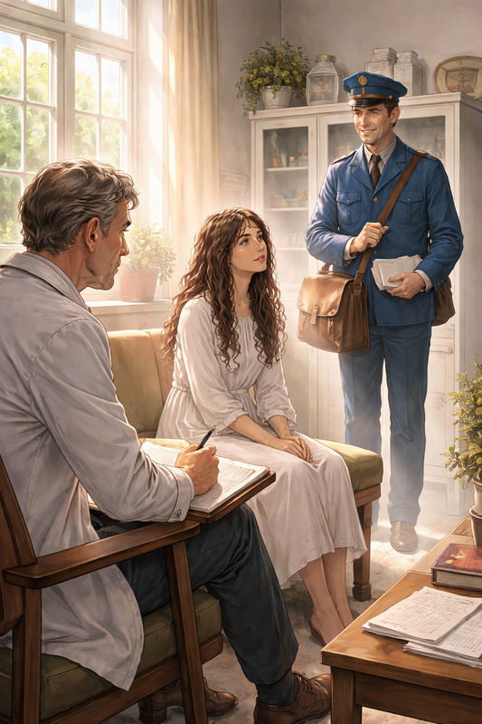 Вона не відповіла. Вона дивилася прямо за його плече, де в кутку кімнати, спершись на шафу з ліками, стояв він. Її листоноша. У синій формі, з важкою шкіряною сумкою через плече, він м’яко посміхався їй, підморгнувши, ніби вони вдвох щойно почули щось дуже смішне.