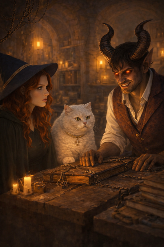 — О, яка чарівна відьма забрела в мої нетрі, — промуркотів Астарг, повільно обходячи мене навколо. Його очі спалахнули червоним вогнем. — Твої руді коси пахнуть гірським вітром і... небезпекою. Що така красуня шукає в моїх запилених томах? Можливо, рецепт вічної пристрасті?