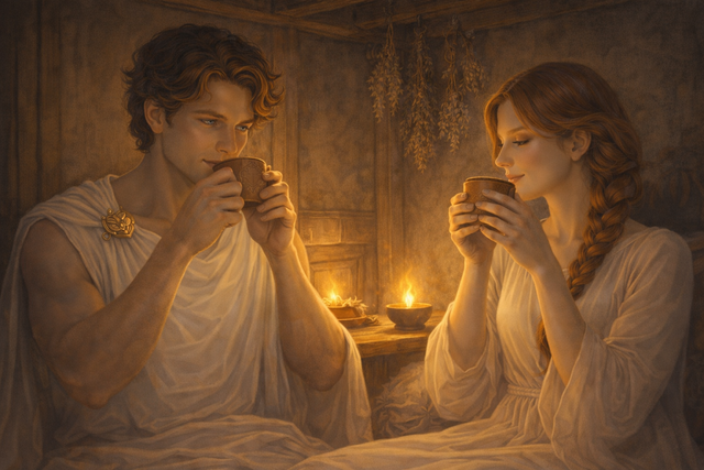 Я дістала сушені трави, що висіли оберемками над піччю, і кинула жменю в глечик. Поставила його на тліючий жар. Вода закипіла майже миттєво — і я розлила ароматний напій у дві глиняні чашки.