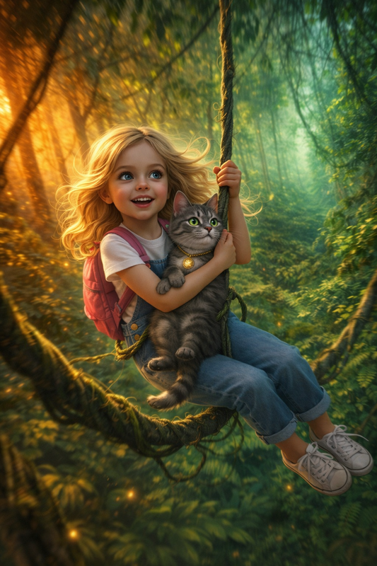 Вона обережно сіла на ліану, відчуваючи, як та м’яко пружинить під нею, і притиснула котика до себе. Той одразу влаштувався в її руках — уже спокійний, довірливий.