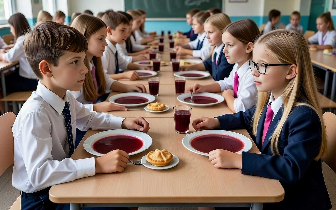 — Сідаймо зручніше, любі, — дбайливо керує вчителька, — та починаємо їсти. За хвилину повернусь, і хліба принесу додатково. В жодному разі не бешкетувати, добре?