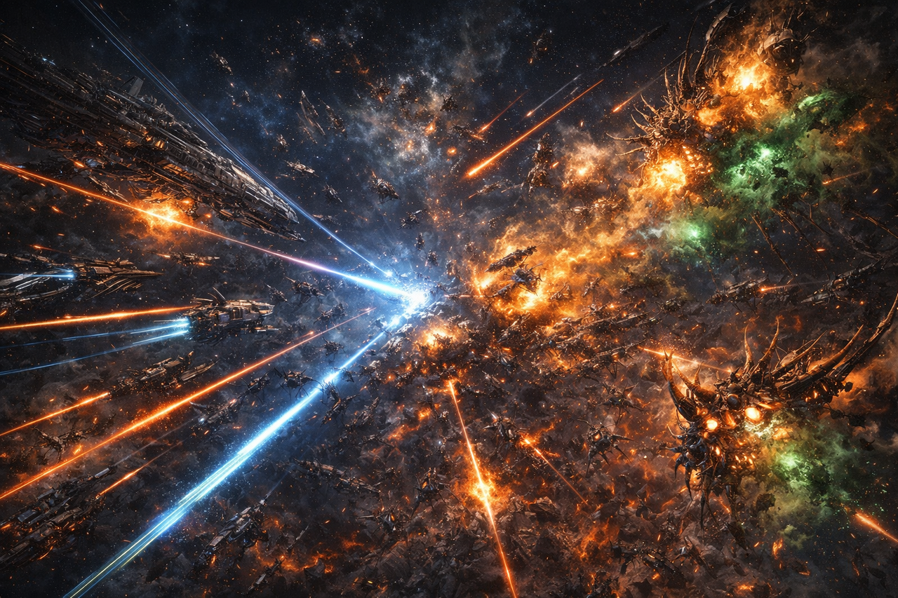 Під час бою космос палав уламками, мов на чорний лід сипали розпечені жарини. Армада Тео і рій Зхаріантів врізалися одна в одну лоб у лоб — і перша хвиля змила все слабке, незахищене або занадто сміливе.