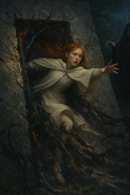 Вона не встигає договорити. Тріщина розкривається. Не в ширину, а в глибину. Наче в камінь ударили зсередини, і з нього виповзає щось, що ніколи не мало бачити наш світ. Перше, що виходить, — не лапа і не голова. Це клята тінь. Вона згущується, збирається у форму, а тоді вже всередині неї проступають деталі: надто довгі суглоби, зуби, як уламки скла, очі, як діри в тканині світу.
