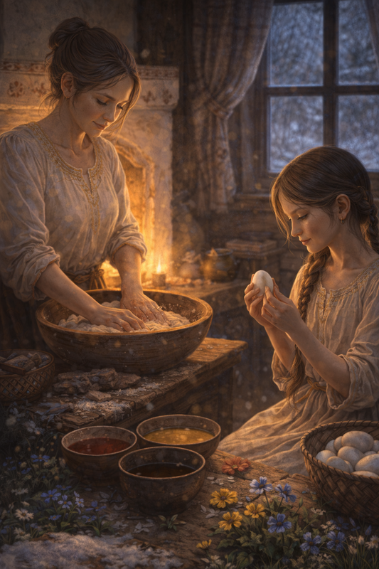 З печі пішов жар. Хліб піднявся. Яйця у відварах повільно набирали кольору, а за стінами хати сонце підіймалося все вище, та все ще було холодним.