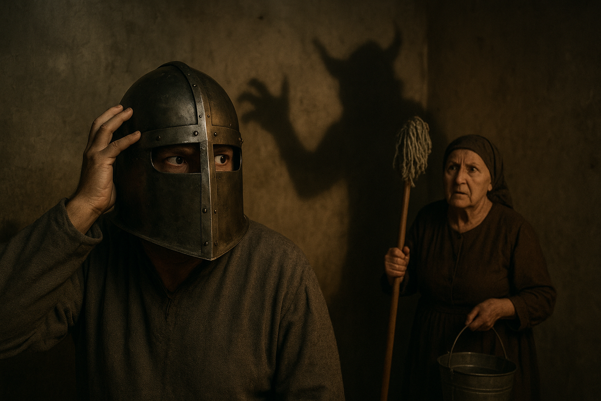 Степан Борисович якраз саме встиг натягнути на голову лицарський шолом, як спершу на стінах з'явилися страшна химерна тінь, а слідом за нею й сама баба Зіна озброєна шваброю та відром з водою.