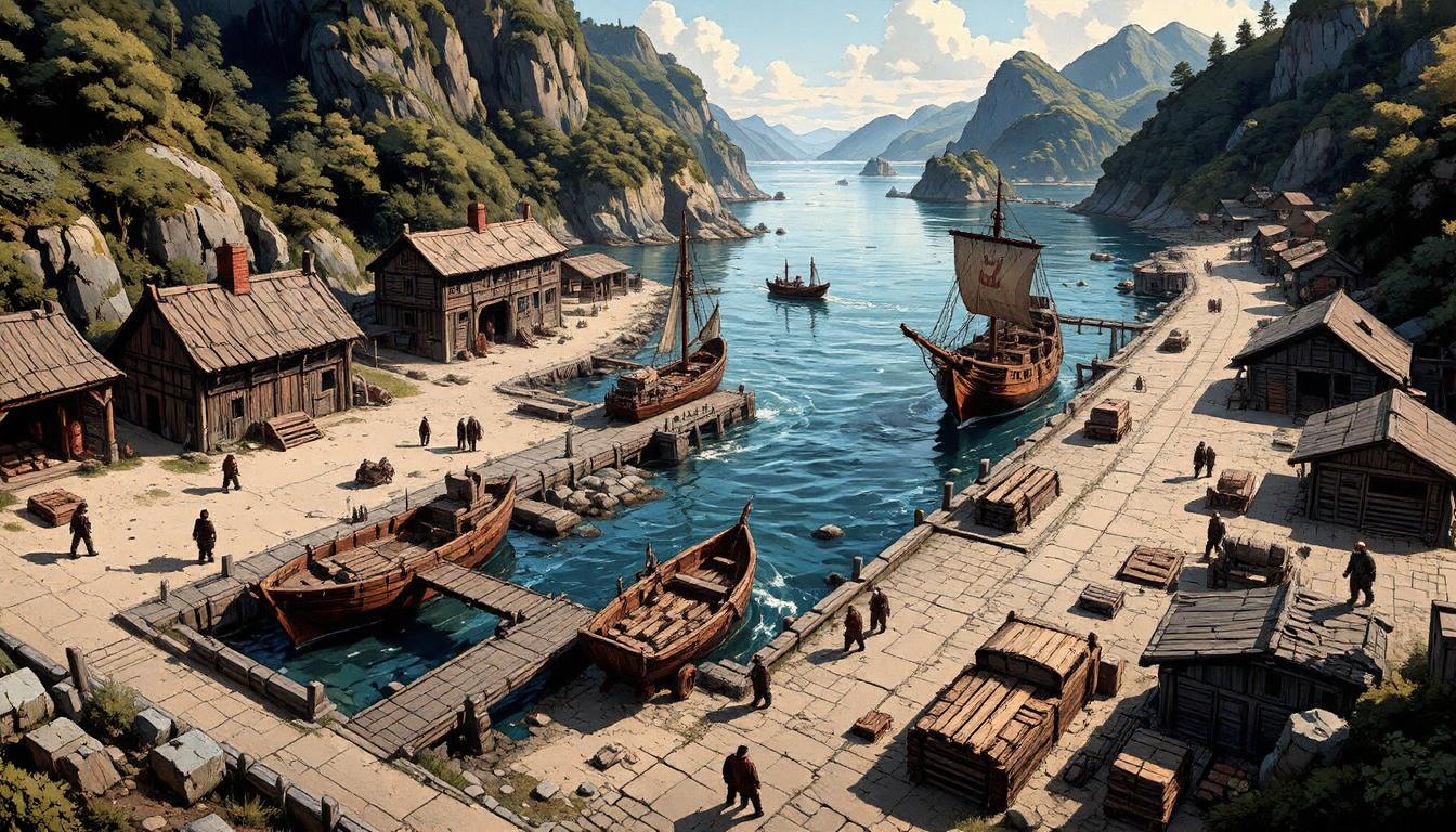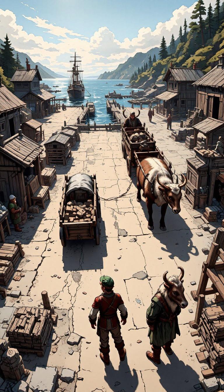 Як і дороги на Ціанорі, вся площа порту була вимощена великими дерев’яними брусами. Порт мав чотири довгі дерев’яні пірси, що давали змогу обслуговувати одночасно вісім кораблів. Біля двох з них були пришвартовані торгівельні кораблі. В нашому світі їх би назвали «середньовічними». На один з них завантажували дрова. Інший, напевне, лише прибув. Вантаж скла та мішків із зображенням кавових зерен наштовхував на думку, що корабель прибув із Террано.